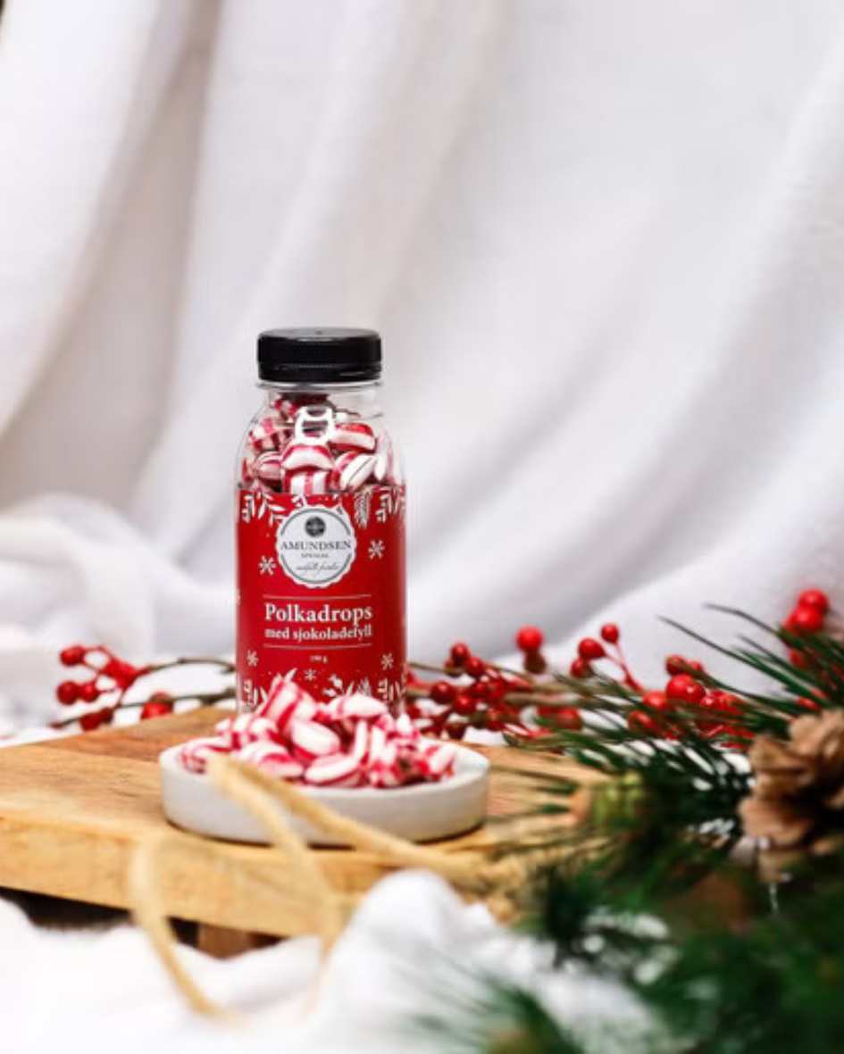 Polkadrops med sjokoladefyll – klassisk jul med en overraskelse Tradisjonelle polkadrops med et mykt og fyldig sjokoladehjerte. Den friske mintsmaken kombinert med søt sjokolade gir en nostalgisk og overraskende god julefavoritt. Perfekt for: Søte pauser i førjulstiden Gaveposer og juledekor Den klassiske julesmaken – med et moderne tvist