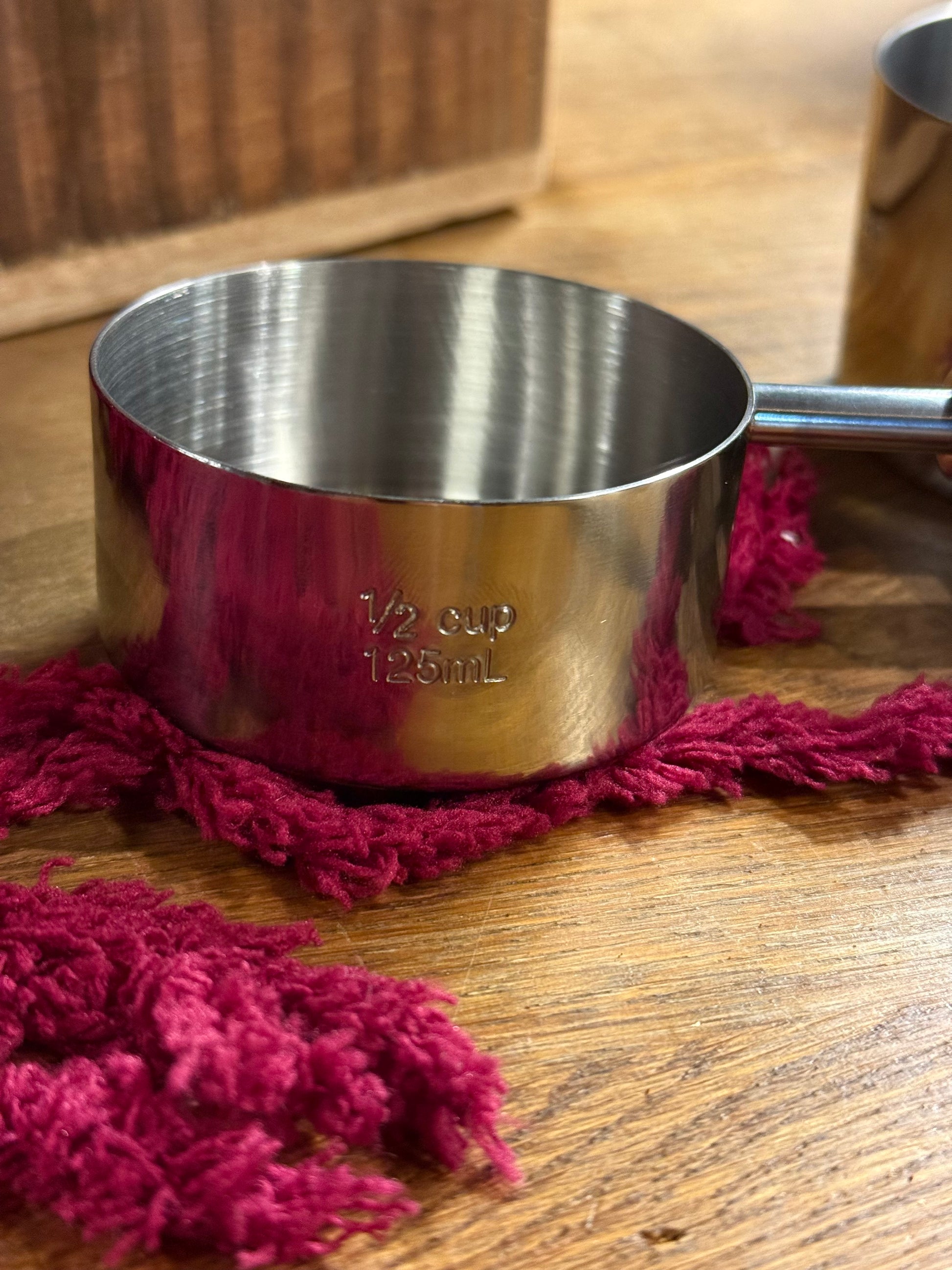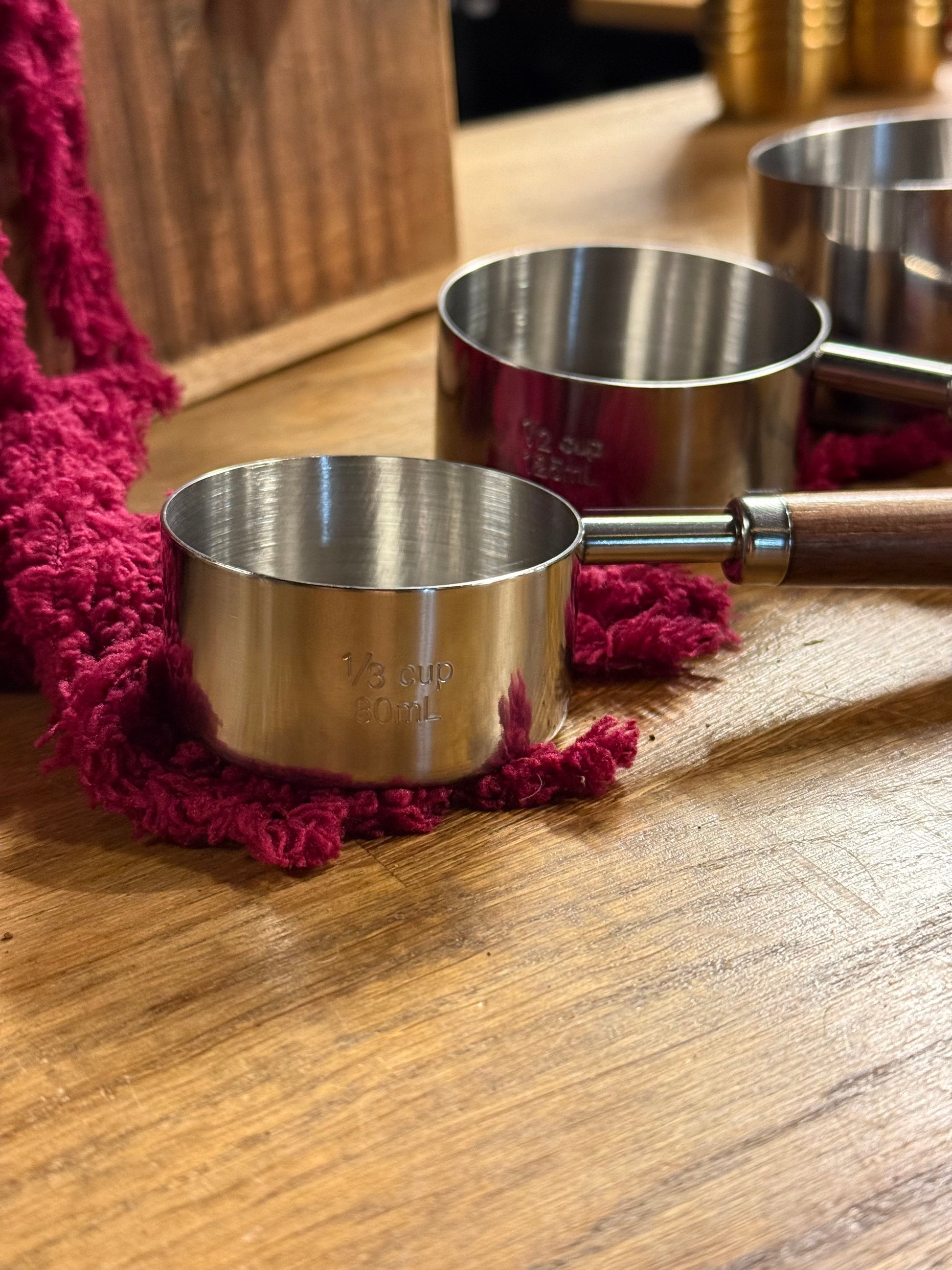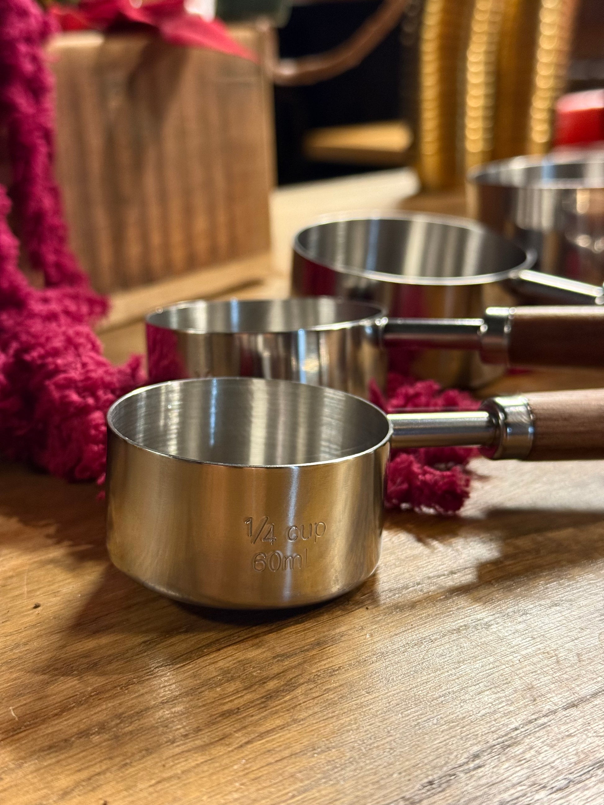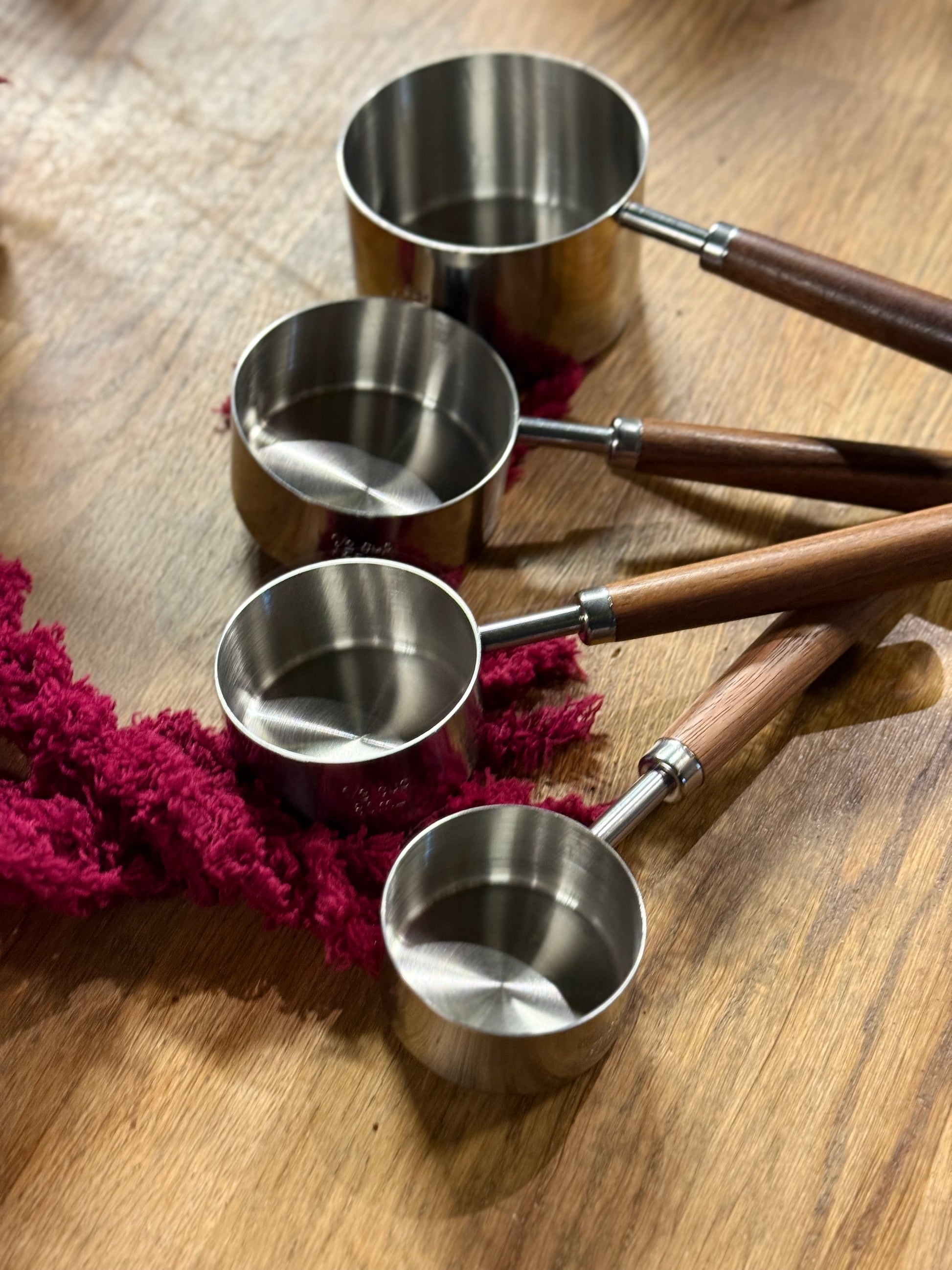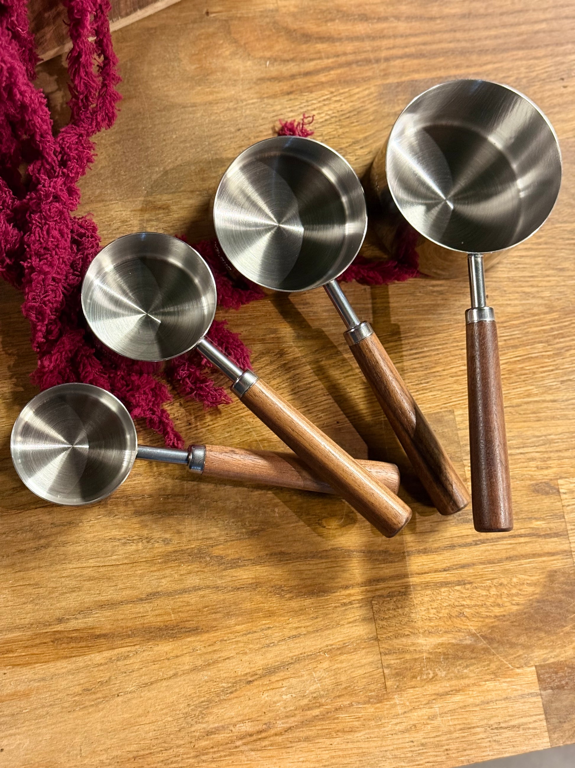 Et målesett i rustfritt stål og mørk valnøtt som kombinerer presisjon med et naturlig, varmt uttrykk. De solide stålmålene gir nøyaktige mengder hver gang, mens håndtakene i valnøtt ligger godt i hånden og gjør dem behagelige å bruke. Et funksjonelt og vakkert sett som passer like godt på kjøkkenbenken som i en gavepakke til en som liker å lage mat.